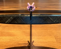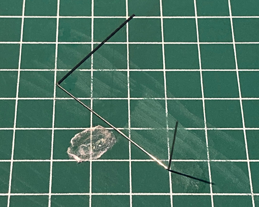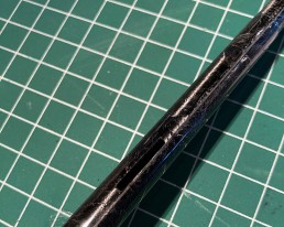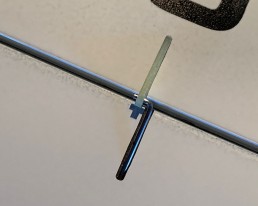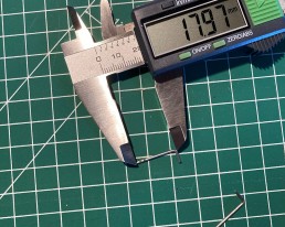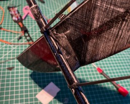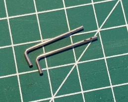 Anfertigen der Ruderanlenkung. Durch die Winkel an beiden Enden lässt sich die Anlenkung nicht in einem Stück durch die Fläche führen. Sie muss zweigeteilt werden. Die beiliegende Anlenkstange hat einen Durchmesser von 1,2 mm. Ich verwende ein Kohlefaserrohr mit 2,0/1,0 mm und bohre es mit 1,2 mm auf. Die Anlenkstange wird aufgeraut und eingeklebt.