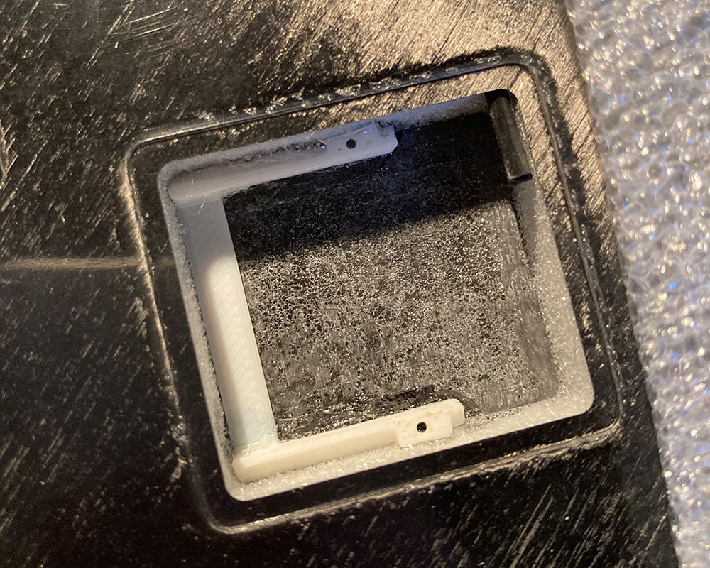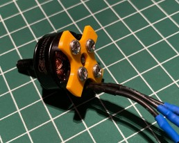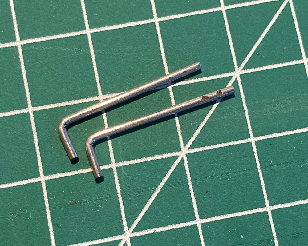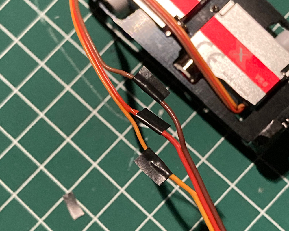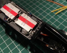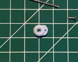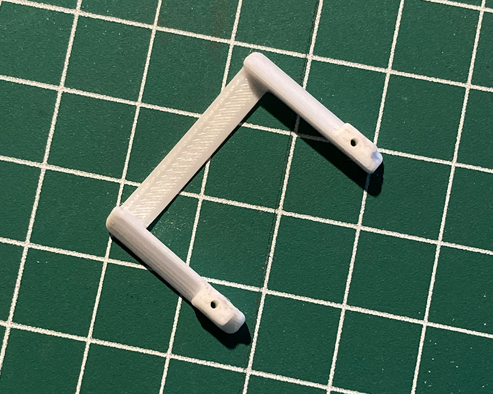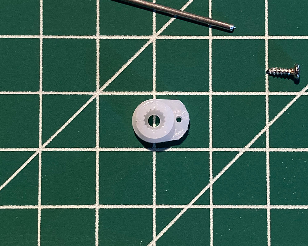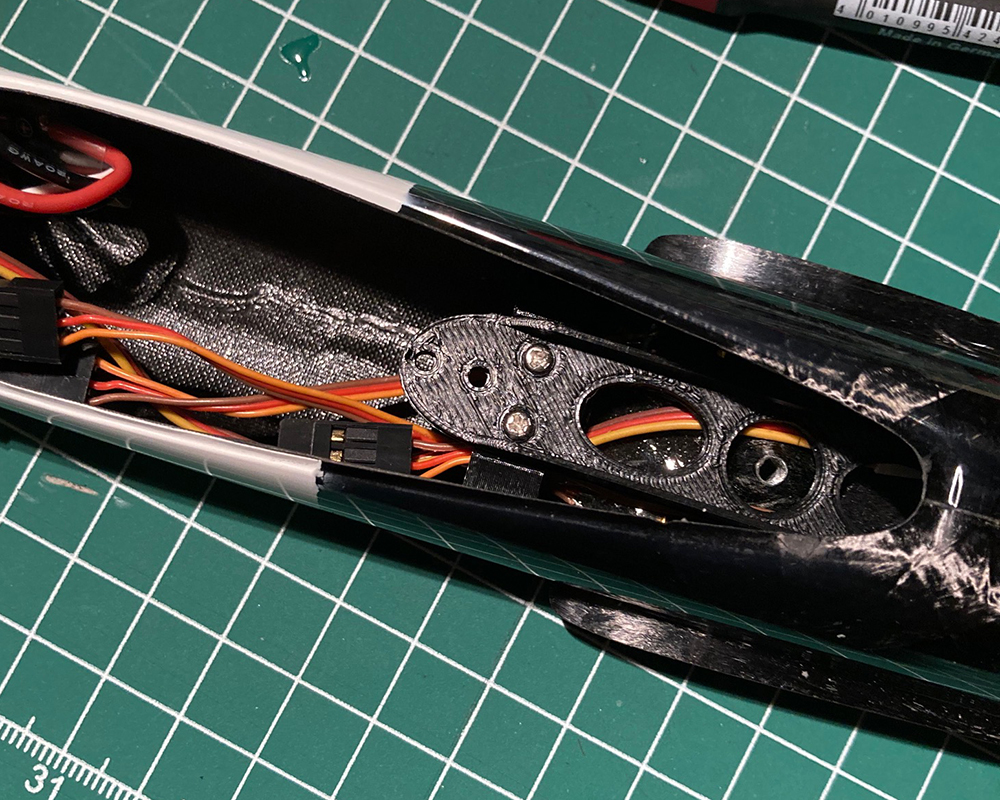 Vorbereiten der Servorahmen. Ich habe diese in einem 3D-Programm angelegt, mein Kollege Jeremy war so freundlich und hat mir diese zweimal im 3D-Druck angefertigt. Vielen Dank dafür. Die Schraubenlöcher habe ich mit einem 1mm-Bohrer nachgebohrt.