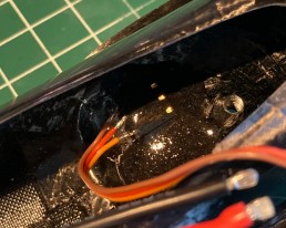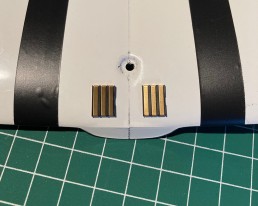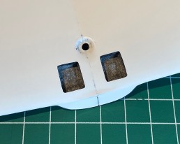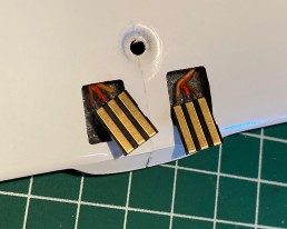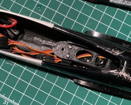 Anbringen der Ruderhörner an Höhen- und Seitenruder. Ich schneide jeweils die Position mit einem Cuttermesser vorsichtig vor und klebe die Ruderhörner mit CA ein. Entgegen anderer Beschreibungen im Netz nehme ich für das Höhenruder das Ruderhorn mit der offenen Öse, da das Höhenruder im Gegensatz zum Seitenleitwerk abgeschraubt werden könnte und damit nur diese Öse Sinn macht.